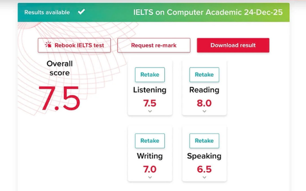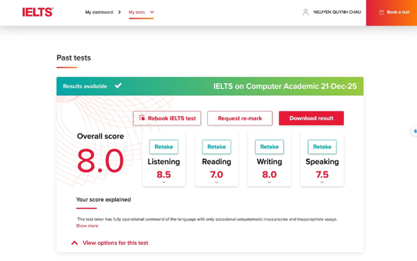 Tầm tháng 8 năm 2025, mình đang là một sinh viên năm cuối chật vật tìm trung tâm luyện thi IELTS uy tín để có thể giúp mình đạt chuẩn đầu ra (C1) của trường. Sau 1 thời gian dài tìm hiểu và đọc review thì mình đã quyết định chọn IELTS 1984 bởi có rất nhiều review tốt trên trang web cũng như trên các trang MXH. Và sau 10 tuần học ở đây, mình - một sinh viên NN Anh tuy đã có thời gian dài tiếp xúc với tiếng Anh (level của mình lúc đấy tầm B2) nhưng kinh nghiệm ôn và thi IELTS bằng 0 - đã (trộm vía) đạt được overall 7.5 trong lần thi đầu tiên. Để đạt được kết quả quá kì vọng này mình thật sự cảm ơn trung tâm IELTS 1984 siêu nhìu, đặc biệt là kỹ năng Writing và Speaking. Với 2 kỹ năng này, khi học tại trung tâm mình đã được cung cấp framework mà thực sự như Trung tâm giới thiệu "Học một lần dùng cả đời", framework này giúp mình viết cũng như nói có logic hơn và có thể sau này mình muốn nâng band cũng có thể tự học dựa trên framework nì :3 điểm siêu riel, rì viu cũng siêu riel nên mng không sợ seeding đâu nha ạaaa :v À thêm nữa là mình học online bên trung tâm nhưng vẫn rất ok vì được theo dõi sát sao và anh chị giáo viên/trợ giảng take care như học offline lun ạ~